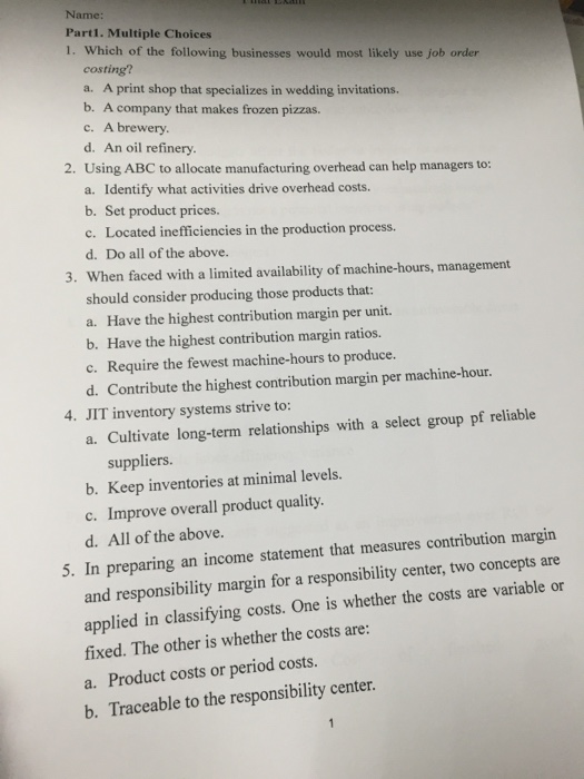 Allocates manufacturing costs to individual jobs to determine unit costs D. Which of the following would be most likely to use process costing. Chapter 5Job Order Costing MULTIPLE CHOICE.